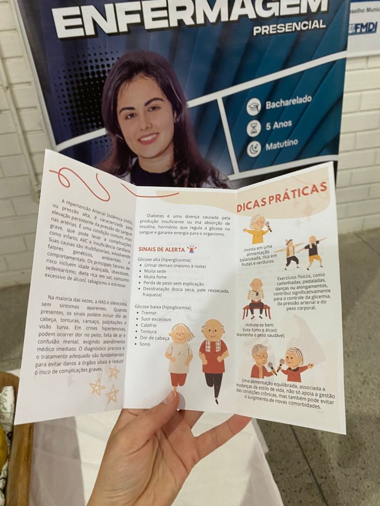 No dia 15 de outubro de 2025, as acadêmicas da 10ª fase do curso de Enfermagem da Unidavi realizaram o projeto de extensão “Aferição dos SSVV na população idosa da Cidade do Idoso”. A atividade aconteceu na Cidade do Idoso, em Rio do Sul, e teve como objetivo principal promover a saúde e o bem-estar da população idosa por meio da verificação de sinais vitais e glicemia capilar, além de orientações sobre o uso correto de medicamentos. Durante a ação, as acadêmicas também distribuíram folders informativos sobre hábitos de vida saudável e frutas, incentivando a adoção de práticas que contribuem para uma melhor qualidade de vida. Ao todo, 91 idosos participaram, aproveitando a oportunidade para esclarecer dúvidas e receber orientações personalizadas.