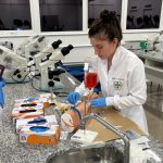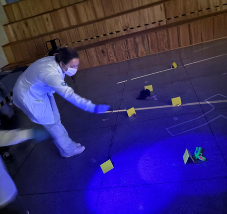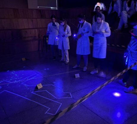 Durante a prática, os acadêmicos trabalharam com a coleta de vestígios e a aplicação de técnicas para identificação de material biológico. Entre os procedimentos, destaca-se o uso de reagentes que simulam o luminol, ferramenta importante em investigações forenses.