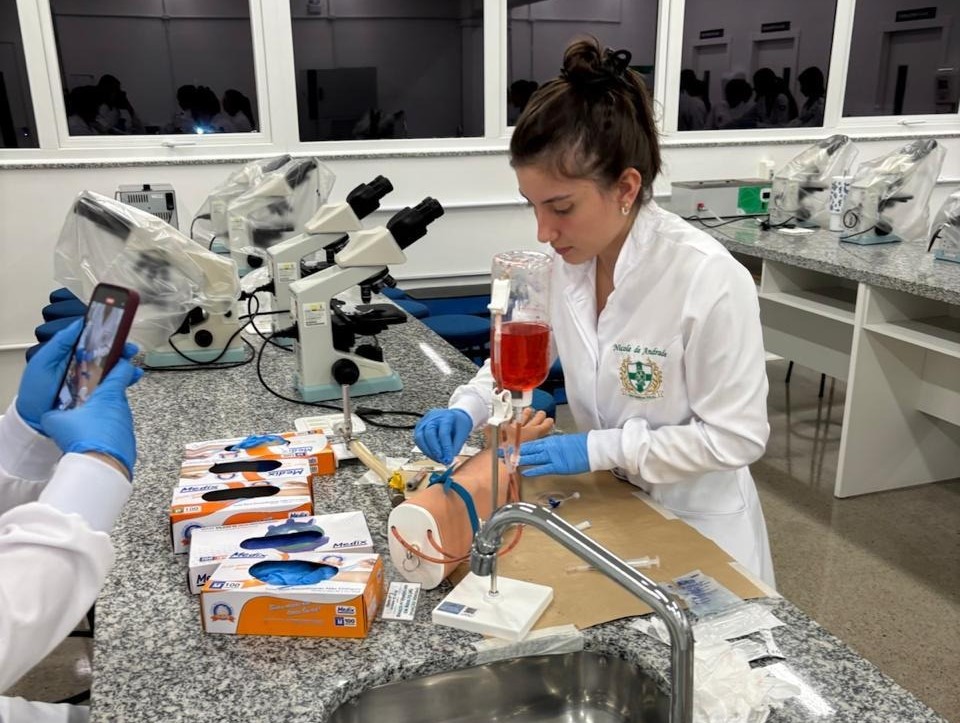 A turma T1 do curso de Biomedicina da Unidavi participou, em 17 de novembro de 2025, de uma aula prática de Hematologia e Banco de Sangue com simulação pericial em cena de crime. A atividade foi realizada em sala de aula adaptada, sob orientação da docente Joycê Saska Moraes de Ávila.