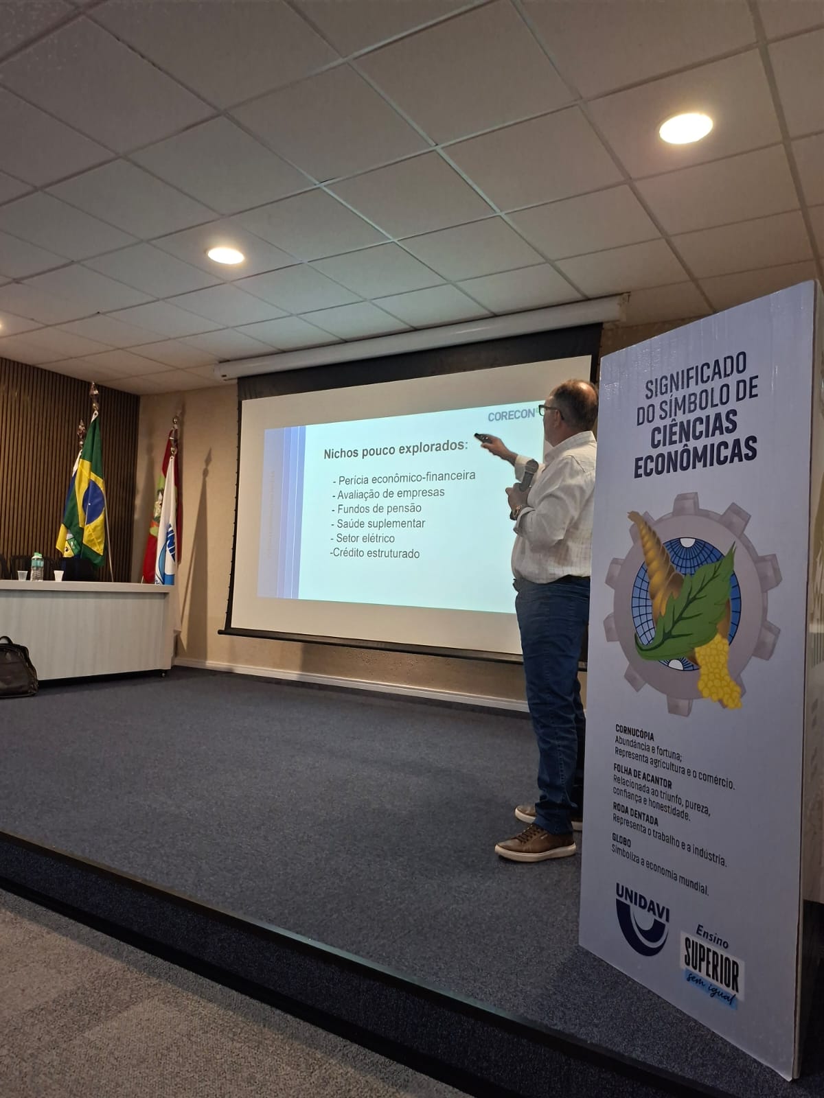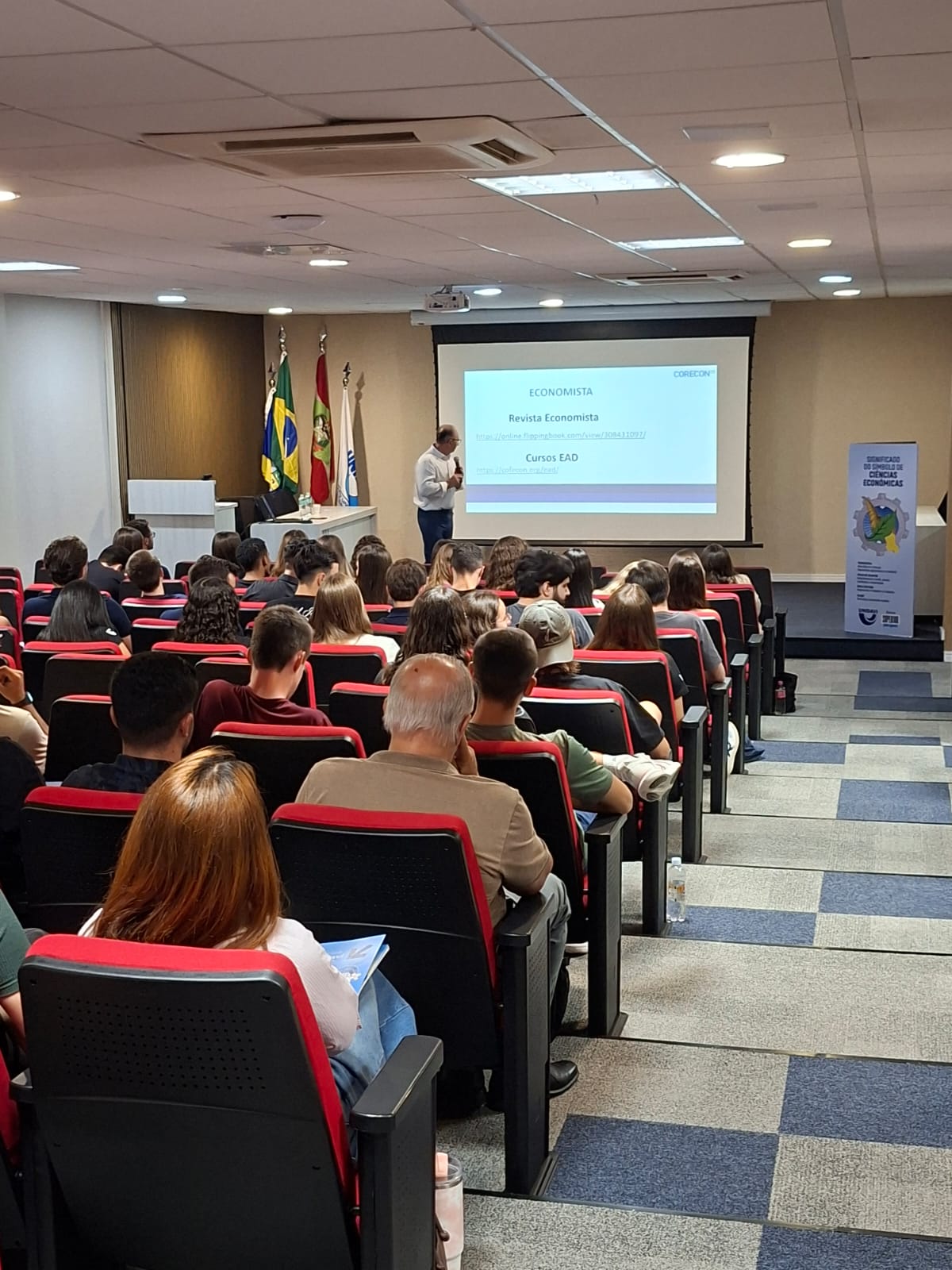 Na sequência, os participantes acompanharam uma palestra sobre o mercado de trabalho do economista. A apresentação foi conduzida pelo presidente do Conselho Regional de Economia de Santa Catarina (Corecon-SC), o economista Ademir Tenfen.