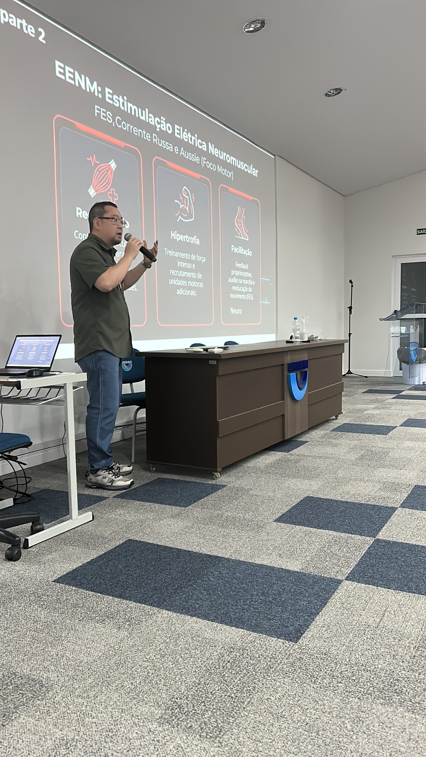 Além disso, foram apresentadas as correntes excitomotoras, como FES, corrente russa e Aussie. O professor reforçou a importância de utilizá-las dentro de um contexto clínico bem definido e associadas a outras abordagens fisioterapêuticas. Também destacou o papel do conhecimento em fisiologia do exercício na definição das condutas terapêuticas.