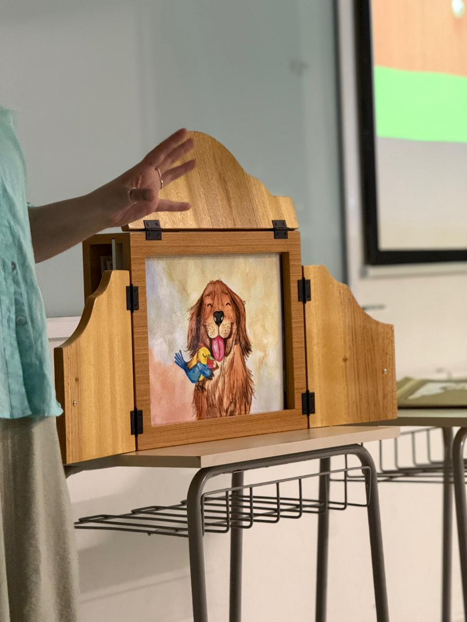 Durante a conversa, Thyara Hirano compartilhou seu processo de criação, suas inspirações e o diálogo entre o teatro e a literatura. Os estudantes da Pedagogia Unidavi também puderam conhecer de perto o formato do livro em Kamishibai, que permite destacar as páginas e utilizá-las em um butai — um pequeno palco de papelão — para realizar a contação da história por meio das imagens.